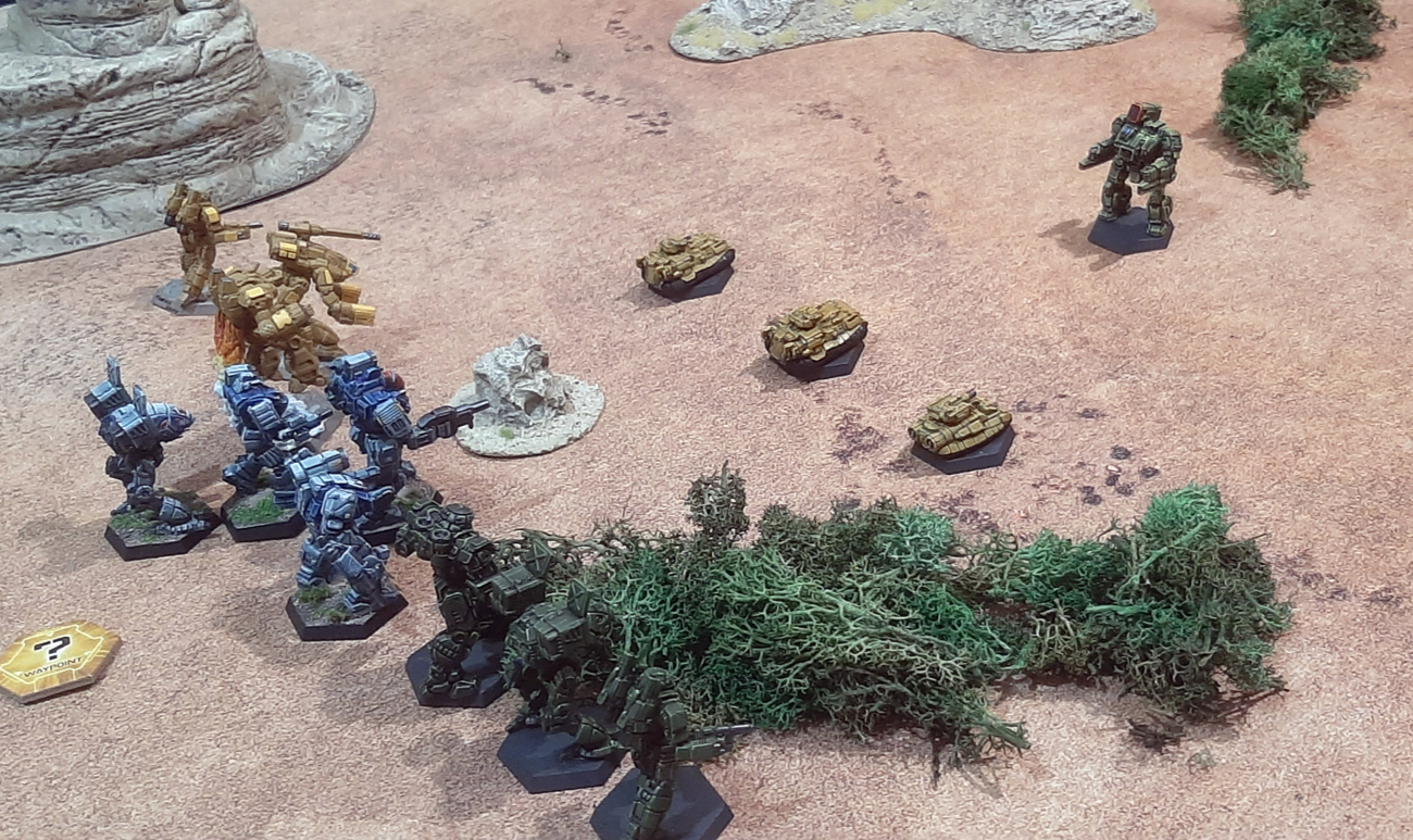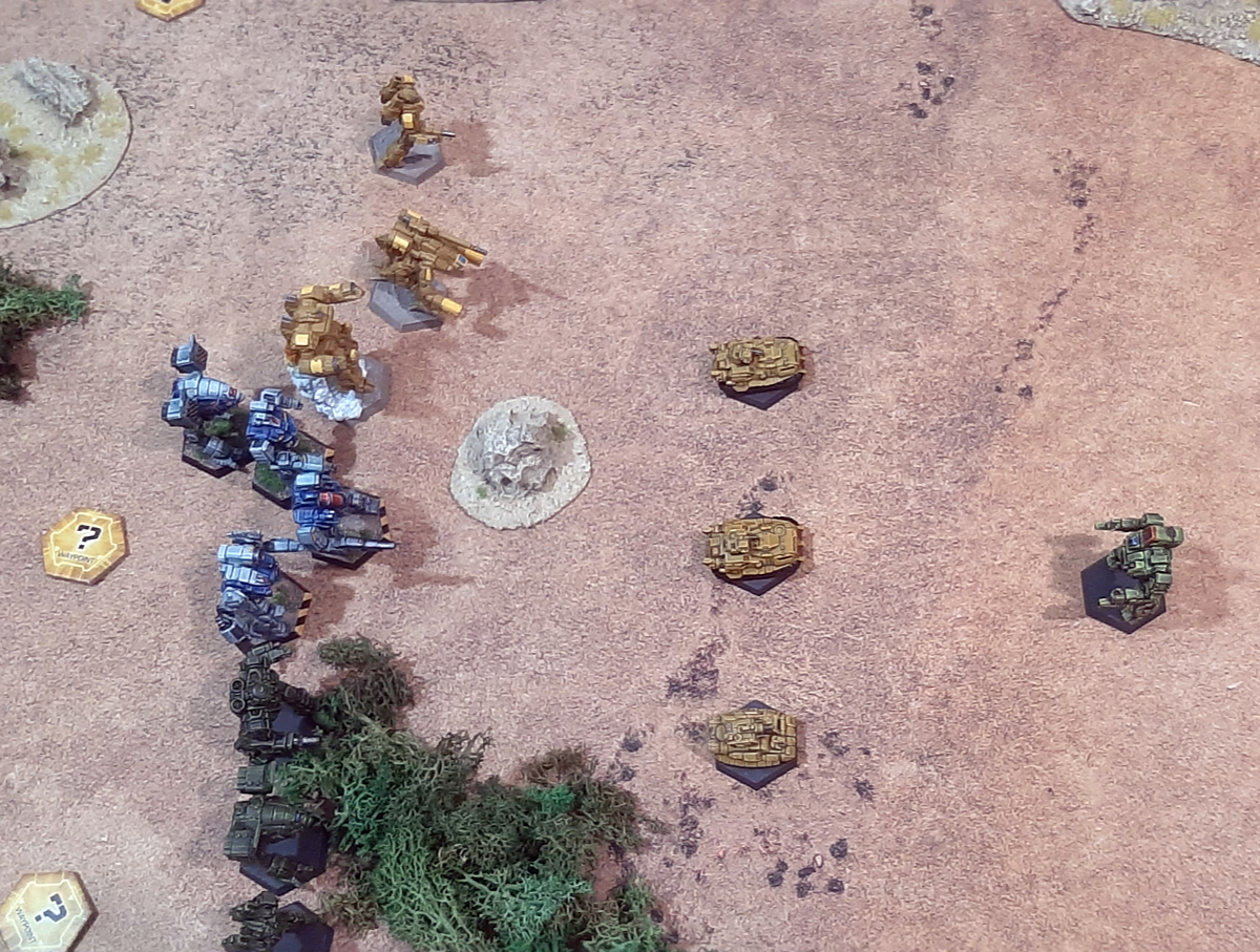 „Lynx“ Tanits Kommando-Lanze besteht aus den sandfarbenen Mechs (gespielt von Cpt. Shandy), die dunkelgrünen Mechs der Scout-Lanze werden von Mohammed Lee geführt (gespielt von Virago), und ich spiele Lt. Priss Cadillacs Feuer-Lanze (blaue und graue Battlemechs).