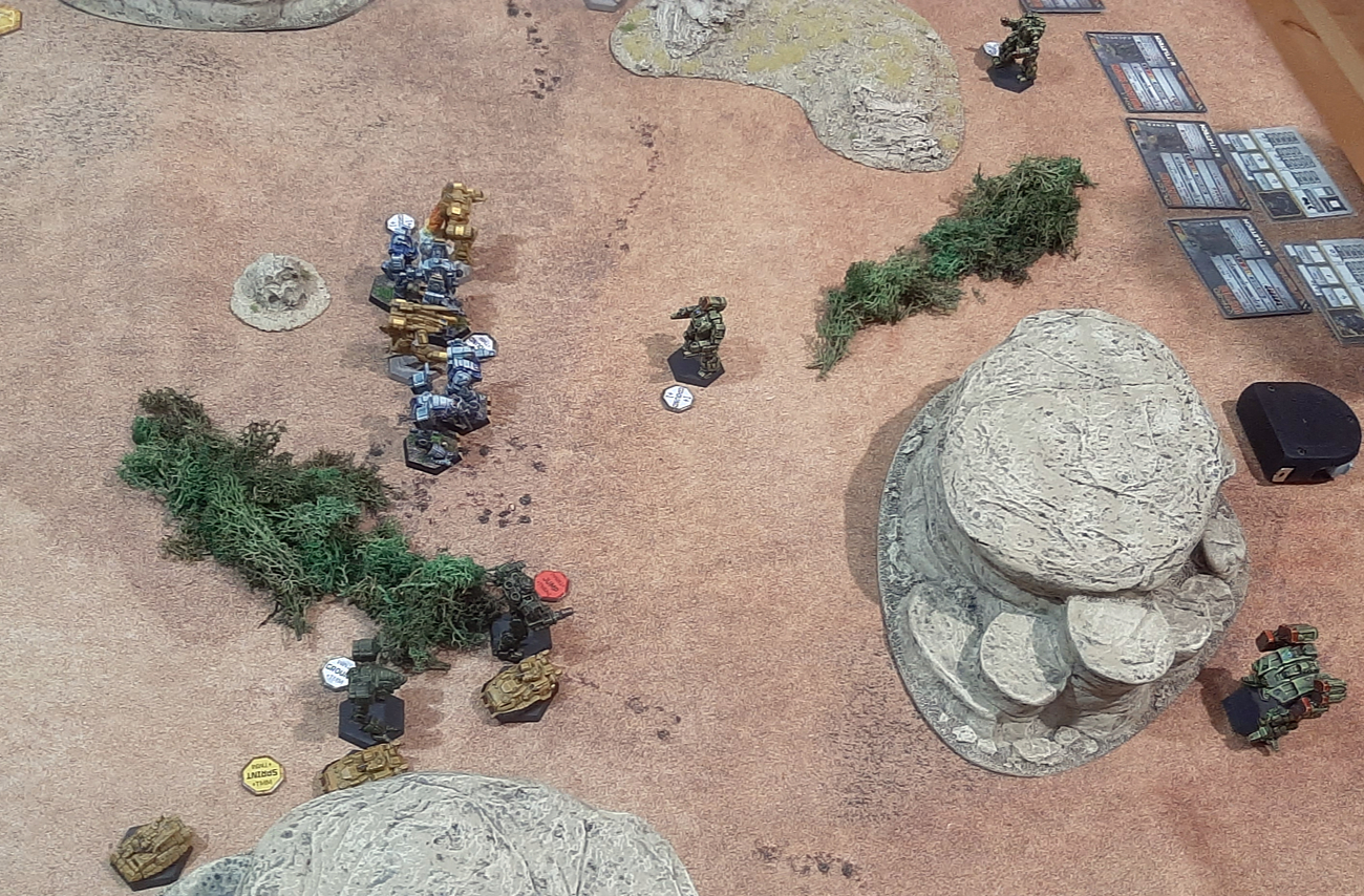Ich bin immer wieder beeindruckt vom Szenariodesign bei Scouring Sands. Normalerweise wäre dies ein extrem geradliniges Szenario, in dem der überfallene Spieler nicht viele Wahlmöglichkeiten hat. Trotzdem ist es den Autoren gelungen, einige Entscheidungspunkte einzubauen. Abgesehen von der Wahl der primären Ziele, die verfolgt werden sollen, liegt es auch an den Spielern, bei Bedarf eine Rückzugsachse für die APCs und Mechs zu wählen, denn die Spieler können wählen, welche der Marker für Zufallsereignisse aufgedeckt werden.