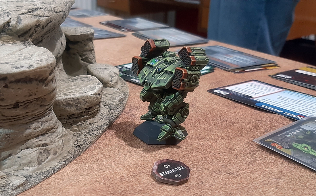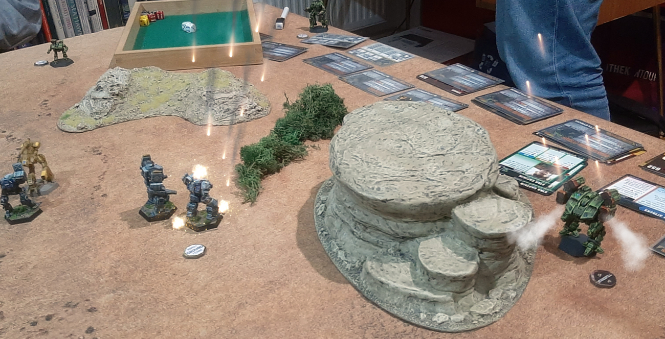Wieder einmal lief es ziemlich gut. Dem feindlichen Thunderbolt IIc gleich alles was wir haben entgegenzuwerfen lag auf der Hand. Trotz der Tatsache, dass dieser Kerl (Pilotenfähigkeiten 2!) dank Plot-Armour unzerstörbar ist, ist es sehr nützlich, seinen Mech so weit wie möglich lahmzulegen. Während des gesamten Spiels haben wir weiter auf ihn geschossen, um den Systemen seines Mechs mehr kritischen Schaden zuzufügen und so seine Feuerkraft zu verringern. Außerdem erschien es das am ehesten erreichbare Primärziel zu sein, ihn vom Tisch zu jagen. Wir hatten Glück bei einigen Beschussversuchen (Virago hat eine besondere Begabung dafür entwickelt, schlecht zu würfeln, wenn es um das Feuer der Clan-Mechs geht) und damit, dass die Clan-Scout-Mechs nicht in der Ecke auftauchten, durch die wir uns zurückziehen wollten.